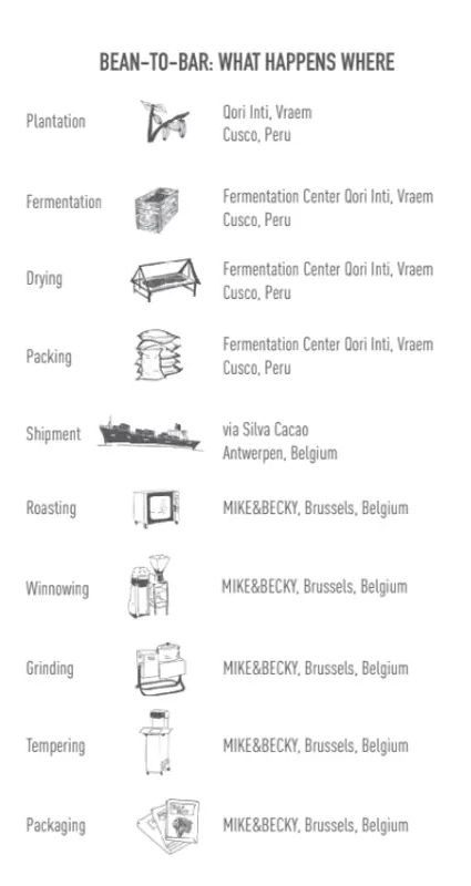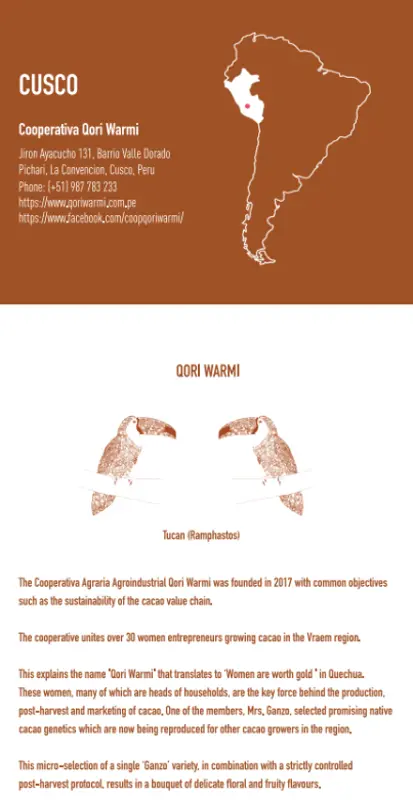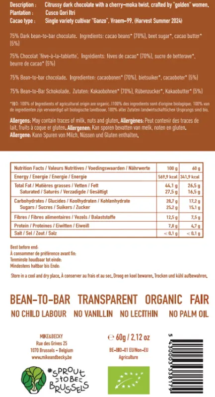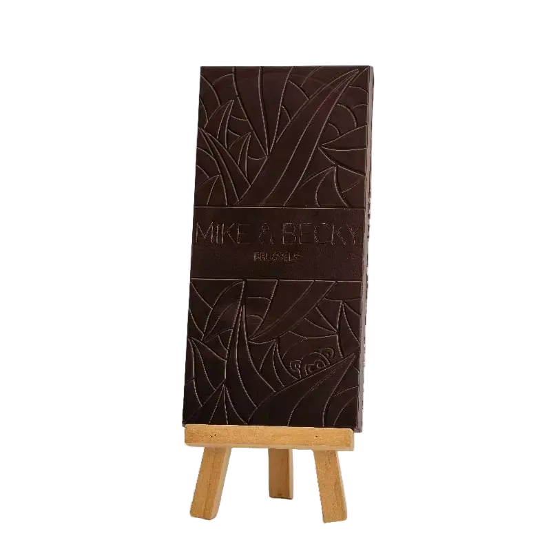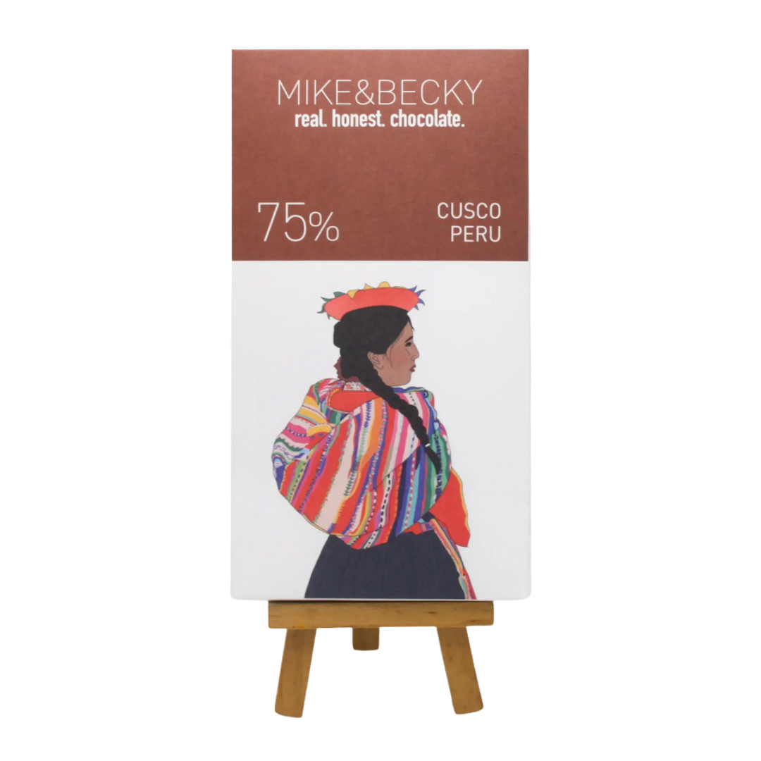 Au cœur des Andes, le cacao de Cusco arrive en sacs à l’atelier bruxellois de Mike & Becky. Trié, torréfié, broyé puis conché, il devient une tablette 75 % au profil précis. En bouche, l’attaque agrumes se fond dans un cœur moka, puis une pointe de cerise étire la finale. La texture est étonnamment crémeuse pour un noir de cette intensité. Recette courte, origine affichée, fabrication bean-to-bar: ici, rien ne masque la fève. Seulement du cacao, du sucre de betterave bio et un peu de beurre de cacao pour porter le goût. Une tablette droite et élégante pour qui aime sentir l’origine avant tout.