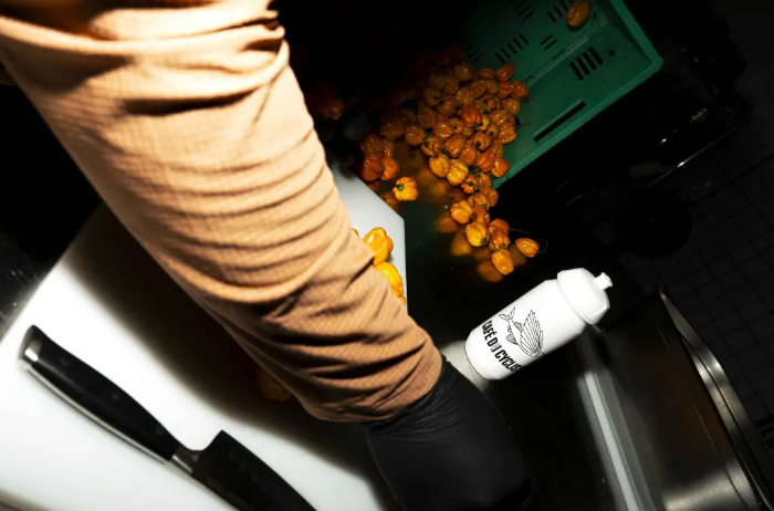 Oignon jaune** · Piment Habanero jaune** · Vinaigre de pomme* · Ail · Olives · Anchois · Sel de mer.